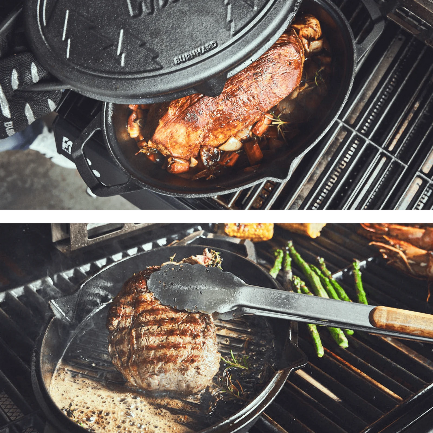 אין כמעט שום דבר שסיר הברזל היצוק החזק הזה לא יכול לעשות: תבשילים צלויים עסיסיים, עוף שלם צלוי, לחם או סטייקים מושלמים עם פסי גריל מהמכסה המחורץ. רק תבחרו.