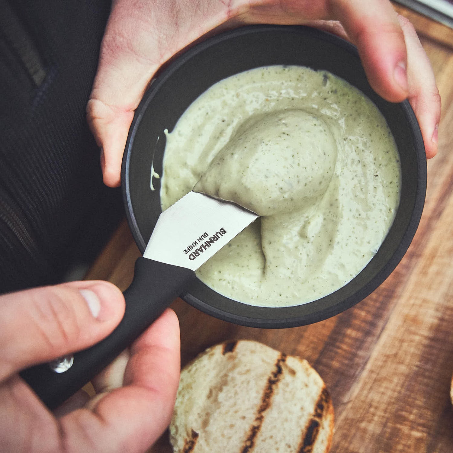 אי אפשר לדמיין המבורגר בלי רוטב איכותי. לכן, סכין הבאן תוכננה לא רק לחיתוך, אלא גם למריחה. הלהב הרחב בעל הקצה המעוגל מושלם לאיסוף נדיב של רוטב ולמריחה חלקה ואחידה על כל שטח הלחמנייה, כמו מקצוענים.