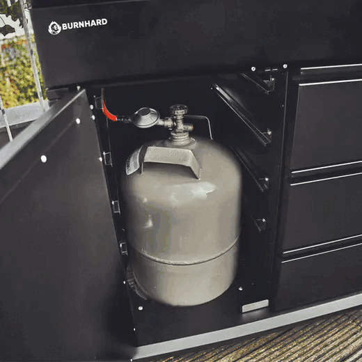 הארון התחתון גדול מספיק לאחסון בטוח של בלון גז של 12 ק"ג. הודות להעברת הצינור בדופן האחורית, ניתן להשתמש בבלון הגז ישירות בעגלה.