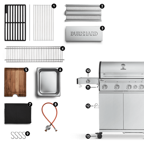 1. רשתות (ברזל או נירוסטה) | 2. מגיני מבערים | 3. תיבת עישון | 4. רשת חימום עליונה | 5. קרש חיתוך (עץ שיטה) | 6. מיכל לבשרים | 7. כיסוי חוץ עמיד | 8. צינור (ללא וסת) | 9. קרסי תלייה | 10. כירת צד | 11. פותחן בירות | 12. מחזיק מגבות נייר | 13. גלגלים עמידים