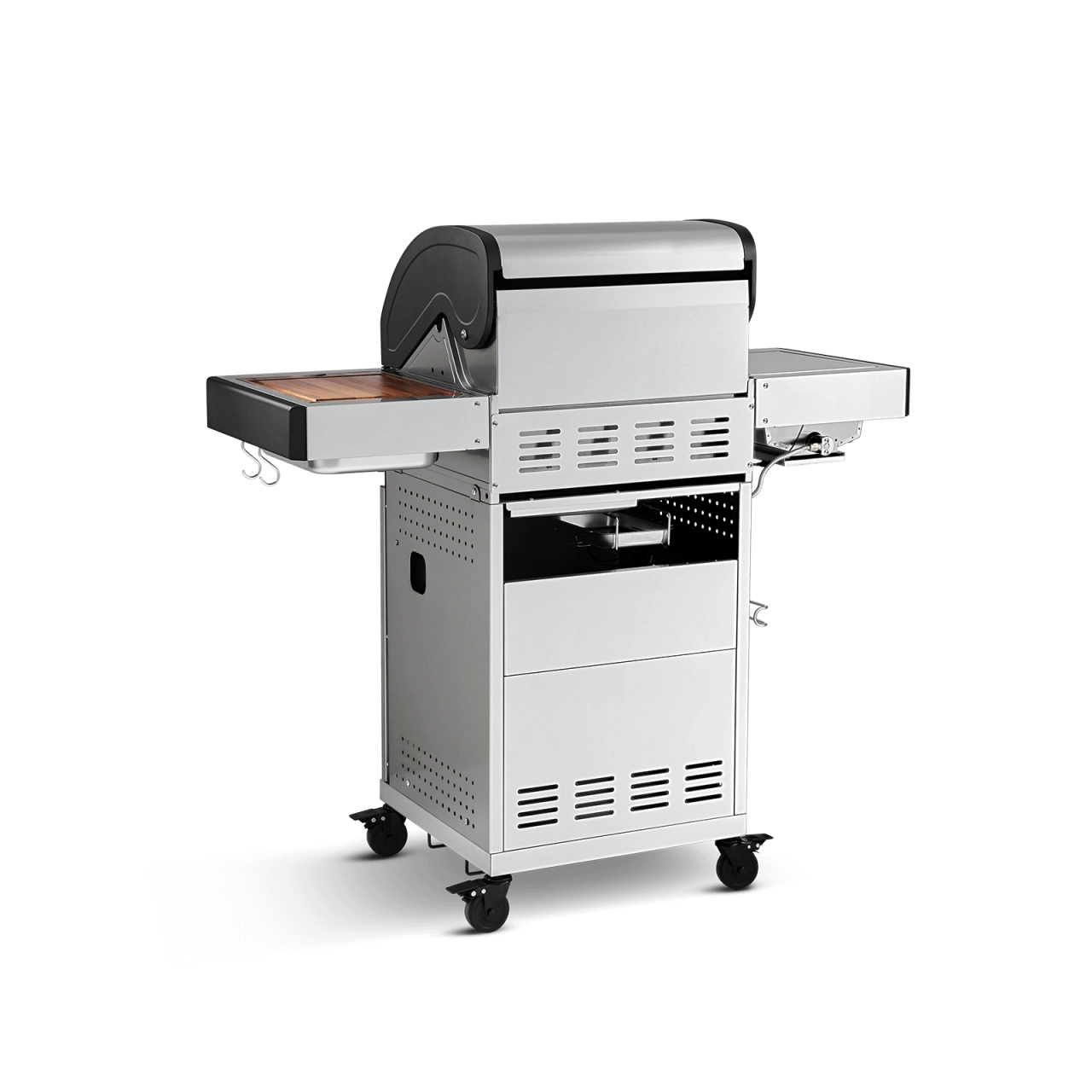 2 מבערי פלדה | מבער אינפרא-אדום קרמי | פותחן בקבוקים מובנה בתוך הגריל | תא נוח לאחסון מזון, מכוסה בקרש חיתוך עבה מעץ שיטה.
