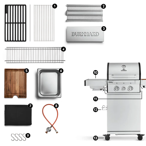 1. רשתות (ברזל או נירוסטה) | 2. מגיני מבערים | 3. תיבת עישון | 4. רשת חימום עליונה | 5. קרש חיתוך (עץ שיטה) | 6. מיכל לבשרים | 7. כיסוי חוץ עמיד | 8. צינור (ללא וסת) | 9. קרסי תלייה | 10. מבער צד | 11. פותחן בירות | 12. מחזיק מגבות נייר | 13. גלגלים עמידים