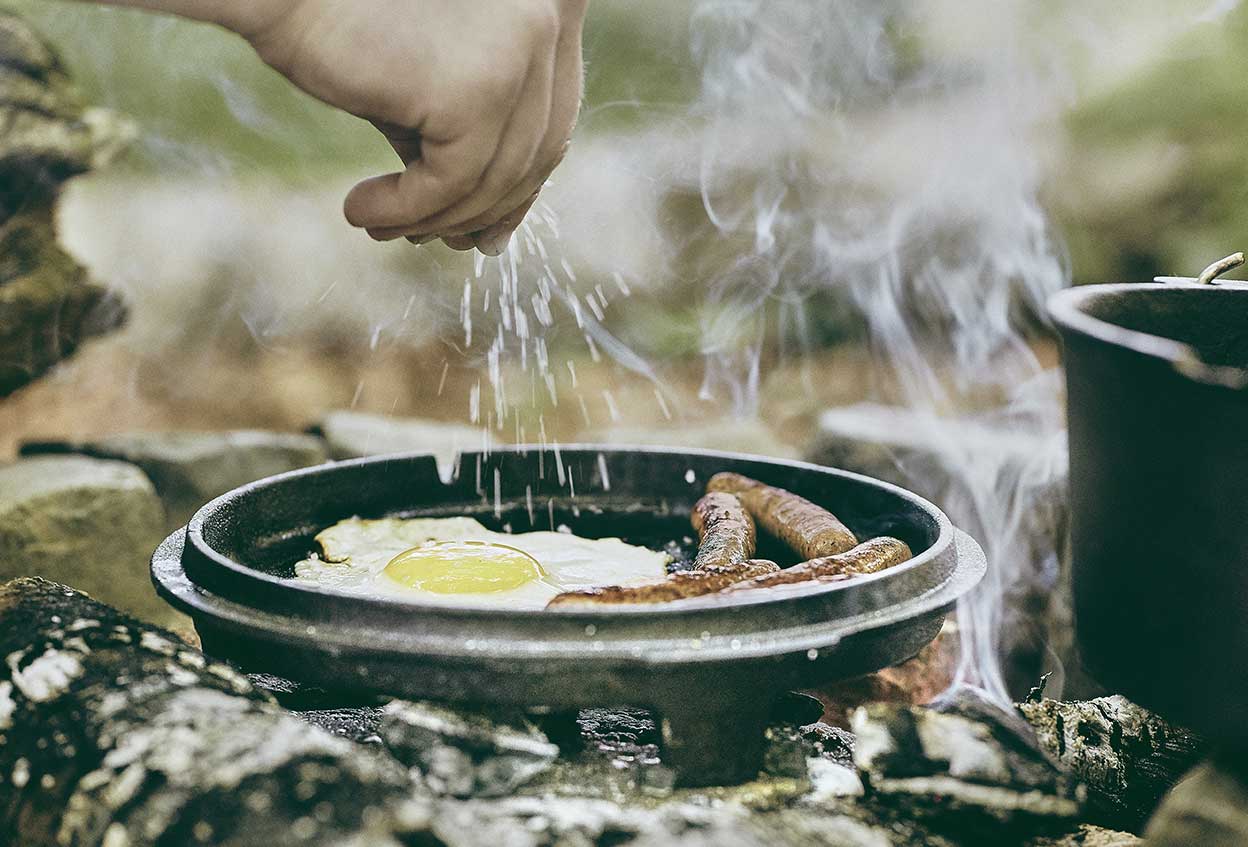 המכסה של ג'ון הקטן הוא לא סתם מכסה. ניתן להשתמש בחלקו הפנימי לצליית בשרים, דגים ואפילו להכנת חביתות. רק צריך להפוך אותו ולהניח ישירות על הגחלים. המכסה מצויד ברגליים קטנות שמקנות לו יציבות על המדורה.